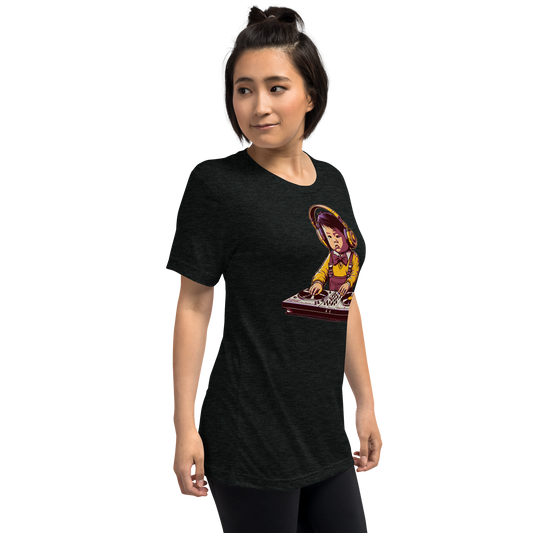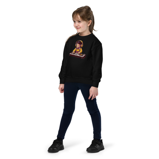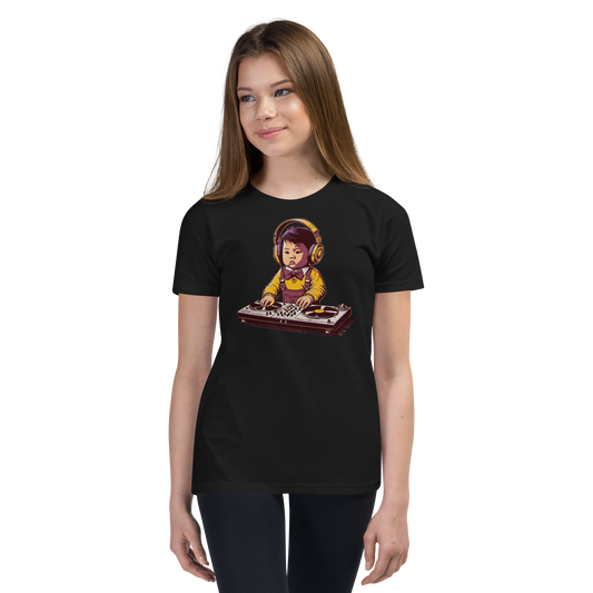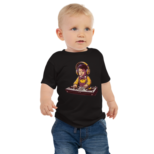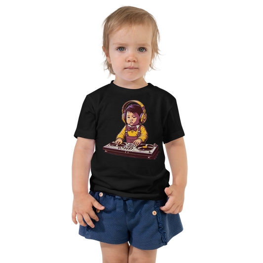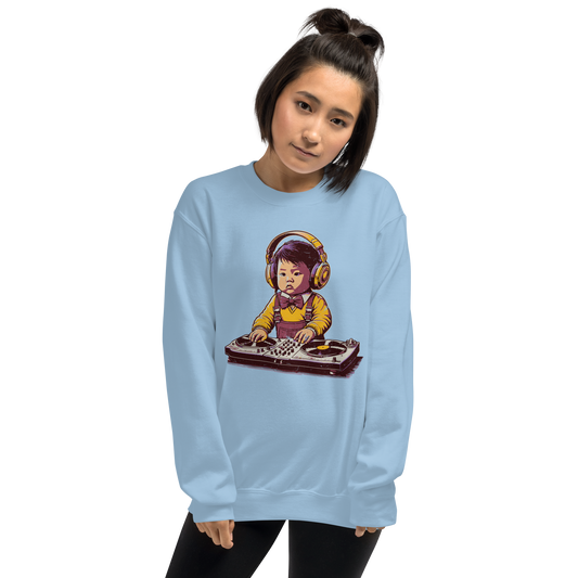 Imagine the adorable scene of an Asian baby, dressed in cute overalls and a vibrant orange shirt, expressing their love for music. Perched on a cushion, the baby wears headphones and stands between two turntables, each hand poised over a vinyl record. With chubby cheeks, the baby exudes joy as they groove to the beat, their tiny fingers ready to spin and scratch. This heartwarming image captures the pure delight of early musical exploration, showcasing the universal language of rhythm and melody.