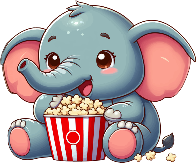 In this charming cartoon scene, a baby grey elephant sits contentedly on its plump bottom, its large ears flapping gently. With a mischievous glint in its eye, the elephant eagerly munches on a vibrant red-striped box of popcorn, its trunk delicately grasping each piece. The popcorn box, adorned with cheerful stripes, contrasts beautifully against the elephant's grey hide, adding a playful touch to the delightful moment. |