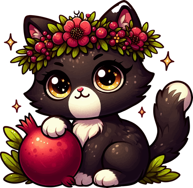 A darling kitten sits beside a plump pomegranate, its glossy fur a delightful contrast to the vibrant hues of the fruit. Perched atop its tiny head is a charming crown of flowers, reminiscent of the regal adornments of the goddess Persephone. With a playful tilt of its head, the kitten gazes at the pomegranate with wide, curious eyes, embodying the innocence and wonder of youth. In this enchanting tableau, the kitten exudes an air of mythic grace, transforming the ordinary into something truly magical. |