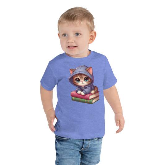 In a charming cartoon vignette, a sweet brown kitten perches atop a stack of two books, one a cheerful magenta and the other a lively shade of green. Adorned in a cozy blueish-purple hoodie, the kitten exudes a sense of snug comfort and playful curiosity. With bright eyes gleaming from beneath the hood, it sits proudly atop its literary throne, a tiny guardian of knowledge and adventure. This delightful scene captures the essence of youthful exploration and the joy of cozy moments spent in the company of a good book.