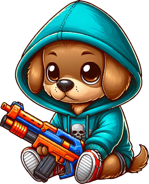 In a whimsical cartoon world, a darling baby puppy sits proudly, clad in a teal hoodie that adds a dash of adorable charm to its fluffy form. With a mischievous glint in its eyes, the puppy holds a blaster, its tiny paws grasping the weapon with a playful determination. Despite its small size, there's an air of bravery about the puppy as it sits confidently, ready to embark on an epic adventure. This delightful scene captures the spirit of youthful imagination and the thrill of heroic escapades in a world where even the tiniest heroes can wield great power.