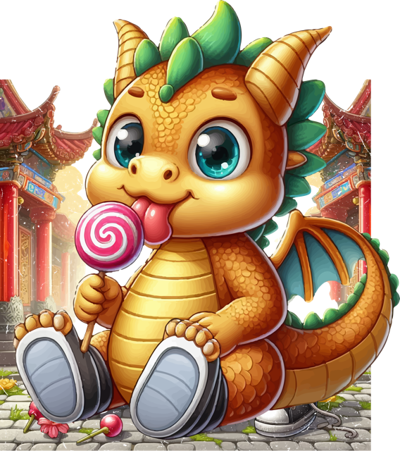 Picture a charming scene in a serene Japanese stone courtyard, where a delightful cartoon baby dragon resides. With iridescent scales shimmering in the sunlight, this tiny dragon sits contentedly, enjoying a sweet lollipop. Its small wings flutter with excitement as it savors the sugary treat, adding a touch of whimsy to this tranquil setting.