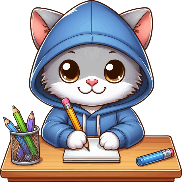 Imagine a scene of studious determination as a cartoon grey kitten sits at a desk, clad in a cozy blue hoodie. With focused intent, it holds a pencil in one hand, poised over a sheet of paper. With an air of curiosity and readiness to learn, this adorable feline embodies the spirit of academic adventure. |