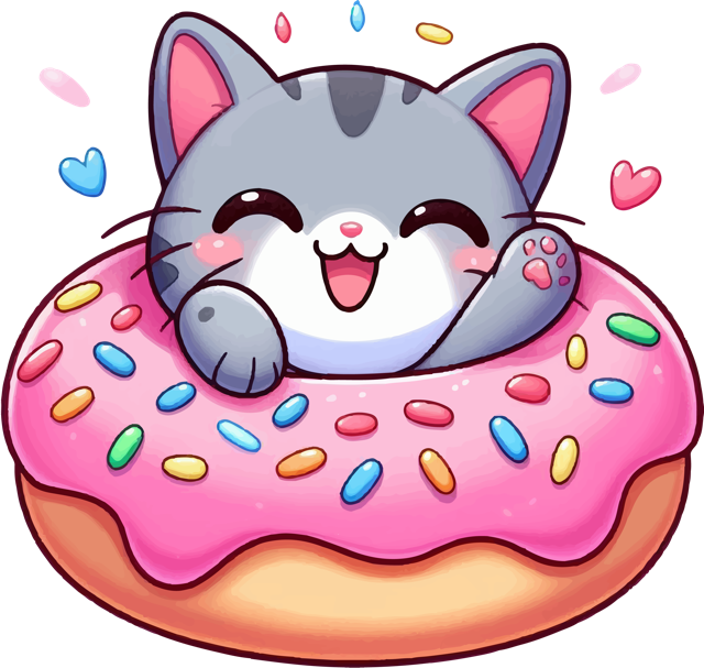 Picture a scene of pure joy as a cartoon baby grey kitten sits snugly within a giant pink donut adorned with colorful sprinkles. With a contagious giggle, the kitten's eyes light up with happiness, its tiny paws playfully held up in excitment. It's a heartwarming moment encapsulating the simple pleasures of life in the most delightful way.