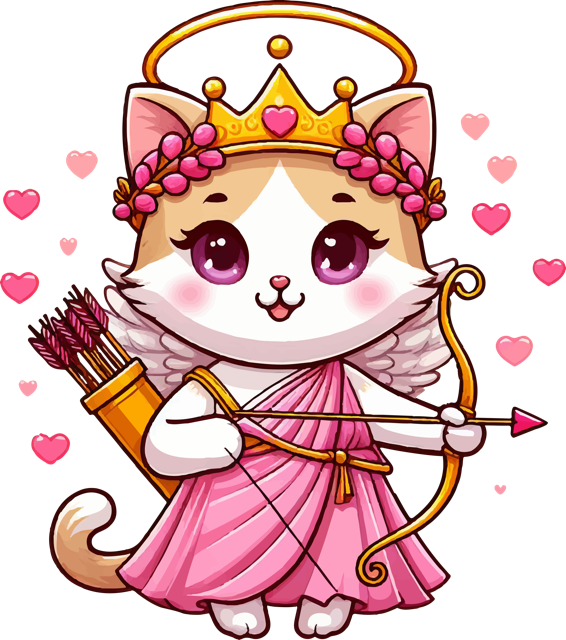 Picture a charming sight: a cartoon kitten embodies the timeless beauty and allure of Aphrodite, the goddess of love. Wrapped in ethereal robes that cascade like soft clouds around her, the kitten exudes an aura of grace and enchantment. With a delicate bow held daintily in one paw and an arrow adorned with hearts in the other, she epitomizes the essence of romantic allure. Hearts swirl around her, adding to the enchanting scene, as she captivates with her feline charm and divine elegance. |