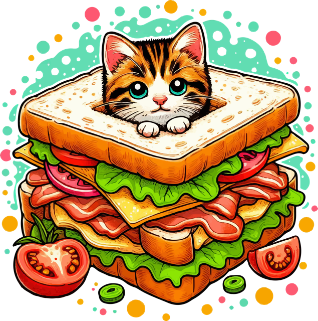 Picture a whimsical scene where a cartoon kitten finds itself nestled within a sandwich, its curious eyes peering out from between the layers of bread. Despite the unusual predicament, the kitten wears a contented expression, perhaps relishing the warmth and coziness of its unexpected abode. This charming depiction embodies the playful nature of cats and adds a delightful twist to the notion of finding comfort in the most unexpected places.