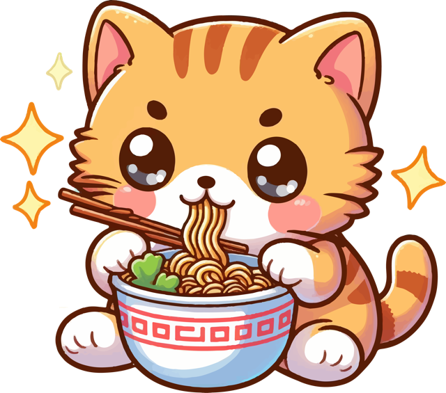 Imagine the sheer delight on the face of a cartoon kitten as it eagerly slurps up a steaming bowl of ramen. With wide eyes and a playful grin, the kitten leans over the bowl, its tiny whiskers twitching with excitement. Noodles dangle from its mouth as it savors each flavorful bite, lost in a world of savory bliss. This charming scene captures the pure joy and enthusiasm of a kitten discovering the irresistible allure of a comforting bowl of ramen.