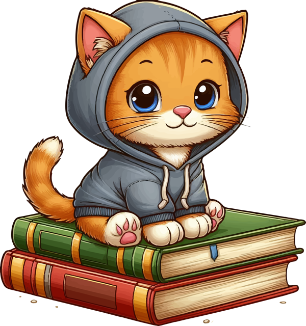 Visualize a scene where a cartoon orange kitten exudes cozy charm, dressed in a snug grey hoodie. Perched atop a towering pile of books, it sits with an air of contentment, its tail curled around its paws. With curious eyes and a playful tilt to its head, the kitten seems lost in thought, perhaps contemplating the wonders within the pages below. This endearing image encapsulates the essence of feline curiosity and comfort, as the kitten finds solace amidst a world of knowledge and warmth. |