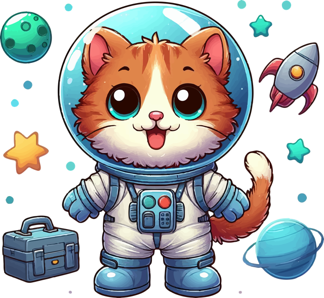 Picture a scene of intergalactic adventure: a cartoon kitten, adorned in a cheerful space suit, floats weightlessly amidst the vast expanse of space. Its eyes twinkle with excitement as it gazes upon a mesmerizing backdrop of distant planets, a majestic spaceship, and countless twinkling stars. With a contented smile, the kitten revels in the awe-inspiring beauty of the cosmos, embracing the boundless wonders of the universe. This delightful image captures the essence of exploration and joy, as the kitten embarks on a cosmic journey filled with endless possibilities.