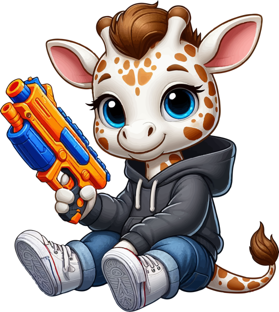 Imagine the endearing sight of a baby white giraffe, its slender form adorned in a snug grey hoodie and tiny denim jeans. Seated with a hint of youthful mischief, the giraffe clutches a foam dart blaster in its dainty hooves, ready for playful adventures. With wide, curious eyes and a playful demeanor, it embodies the innocence and charm of early childhood. This heartwarming scene captures the joy of discovery and the boundless imagination of youth in the most delightful way.