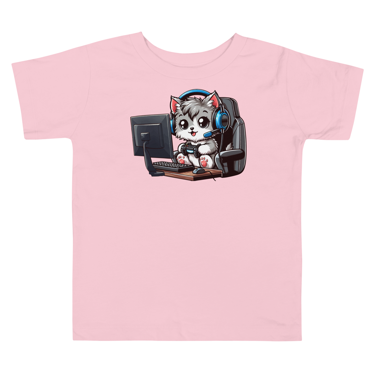 In this adorable scene, a cartoon grey kitten sits comfortably in a gaming chair, adorned with oversized headphones, fully immersed in a gaming session. With a delighted expression and paws poised on the controller, the kitten exudes pure joy as it indulges in its favorite pastime, whiskers twitching with excitement amidst the digital adventures.