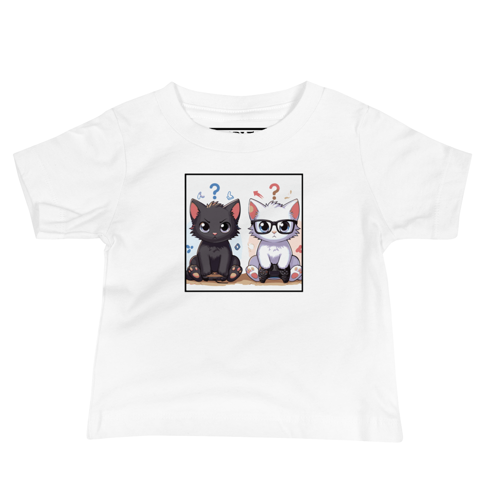 Two cartoon cats sit side by side, one grey and the other white. Both wear expressions of perplexity, as indicated by question marks hovering above their heads. The white cat, distinguished by a pair of sleek glasses, appears engrossed in a gaming session while the grey cat plays with equal curiosity.