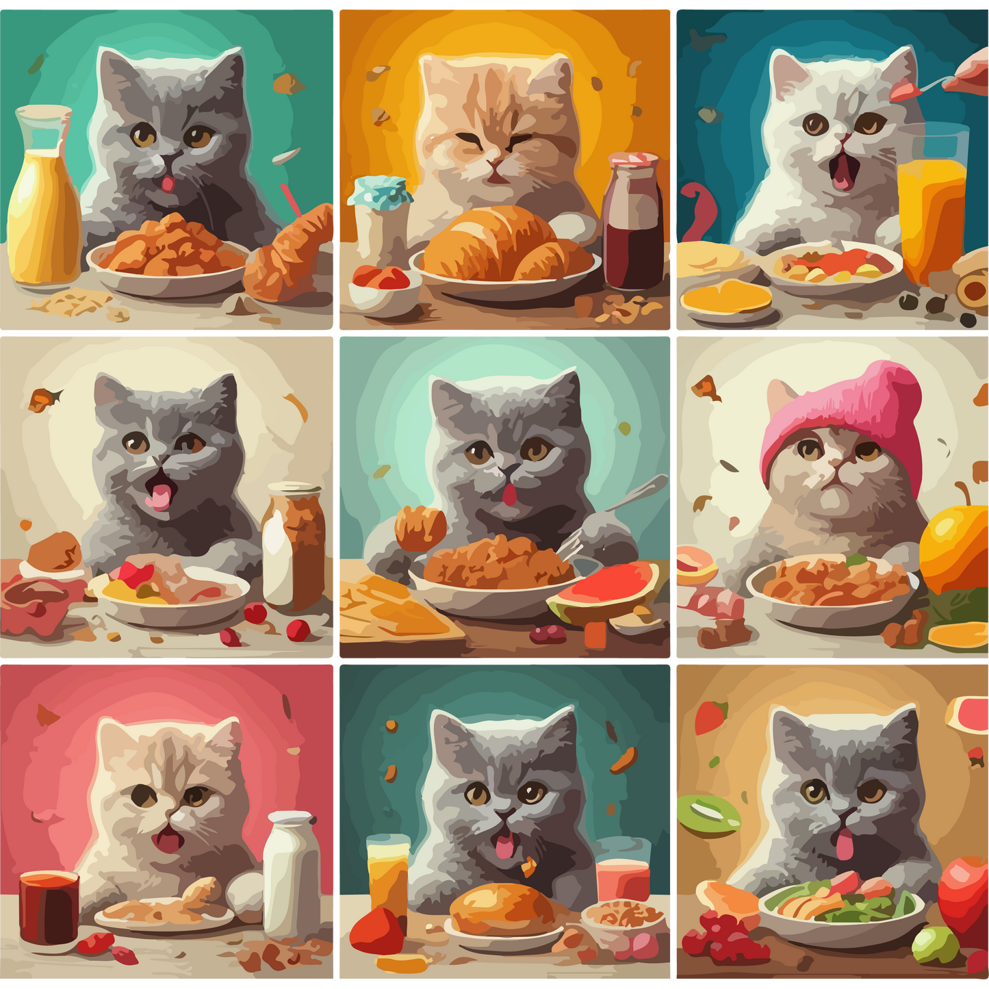 Imagine a charming collage featuring nine adorable kittens indulging in a delightful array of foods and breads. Each kitten showcases its unique personality as they happily munch away on their favorite treats. Some kittens might be nibbling on slices of pizza, while others enjoy the crunch of a croissant or the sweetness of a cupcake. From fluffy loaves of bread to colorful cups of juice, the collage is a whimsical celebration of feline appetite and culinary delight. With their playful antics and enthusiastic eating, these kittens are sure to bring a smile to anyone's face.