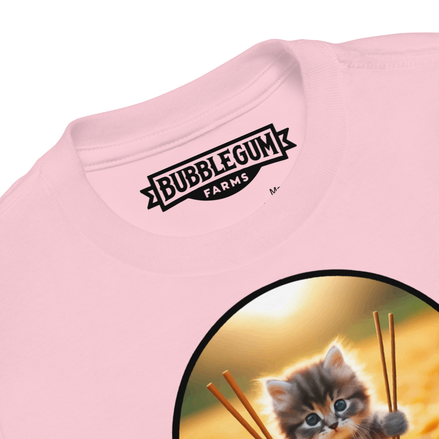 Picture a scene straight out of a dream: a playful kitten dashes through a sunlit field, its fluffy tail held high in excitement. In its tiny paws, the kitten deftly wields a pair of chopsticks, poised to capture delicious morsels of macaroni and cheese that dot the landscape like golden treasures. With each bounding step, the kitten's eyes sparkle with anticipation, lost in a world of cheesy delight and culinary adventure. This whimsical image captures the innocence and joy of a kitten's playful exploration amidst a sea of irresistible comfort food.
