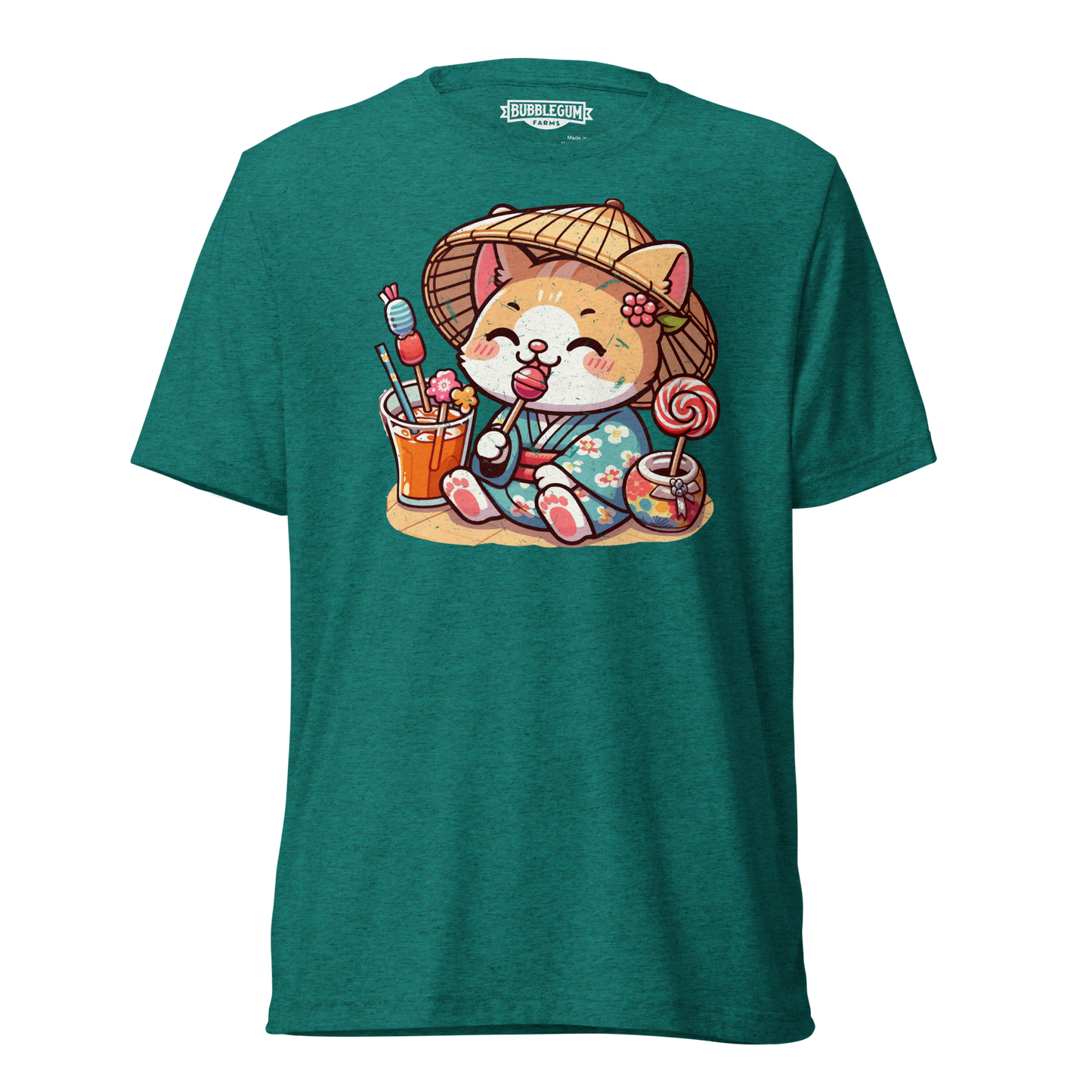 Imagine the epitome of joy embodied in a happy kitten, adorned in a vibrant kimono, its whiskers twitching with delight. With a lollipop held delicately in its paw, the kitten's eyes sparkle with glee as it indulges in the sweet treat. Surrounding the kitten, a container of assorted candies adds to the sugary spectacle, creating a scene of pure bliss and sugary delight. This adorable image captures the essence of playful happiness and innocent enjoyment in a delightful tableau of feline charm.