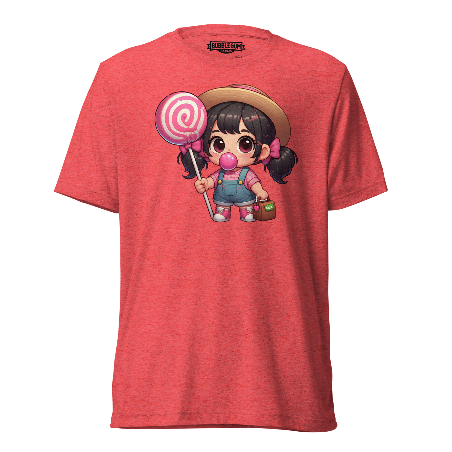 Imagine a scene filled with childhood charm: a little girl with brunette hair styled in adorable pigtails, each adorned with a playful pink bow. She wears a wide-brimmed sun hat atop her head and cute overalls, exuding a sense of innocence and joy. With cheeks puffed out, she blows a giant bubble from a piece of gum, her face illuminated with a gleeful smile. In one hand, she carries an oversized lollipop, a sugary delight almost as big as she is. The other hand holds a woven basket, perhaps brimming with treasures collected on her whimsical adventure. This heartwarming image captures the essence of youthful wonder and playful exploration in a delightful tableau of childhood magic.